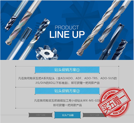 鉆頭促銷(xiāo)對(duì)象1:A系列鉆頭是OSG兼顧刃尖剛性和切削阻力,推薦適用于廣泛加工材料的硬質(zhì)合金鉆頭系列。此次促銷(xiāo)包含通用性鉆頭、平頭鉆、三刃鉆及不銹鋼專(zhuān)用鉆頭產(chǎn)品。